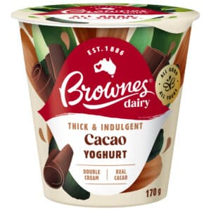 Brownes Dairy Cacao Natural Yoghurt is a delicious treat, minus all the guilt. Made with fresh WA milk, thick and creamy, it’s perfect for a dessert you can feel good about. Packed full of live cultures and free from artificial colours, flavours, gluten and gelatine!